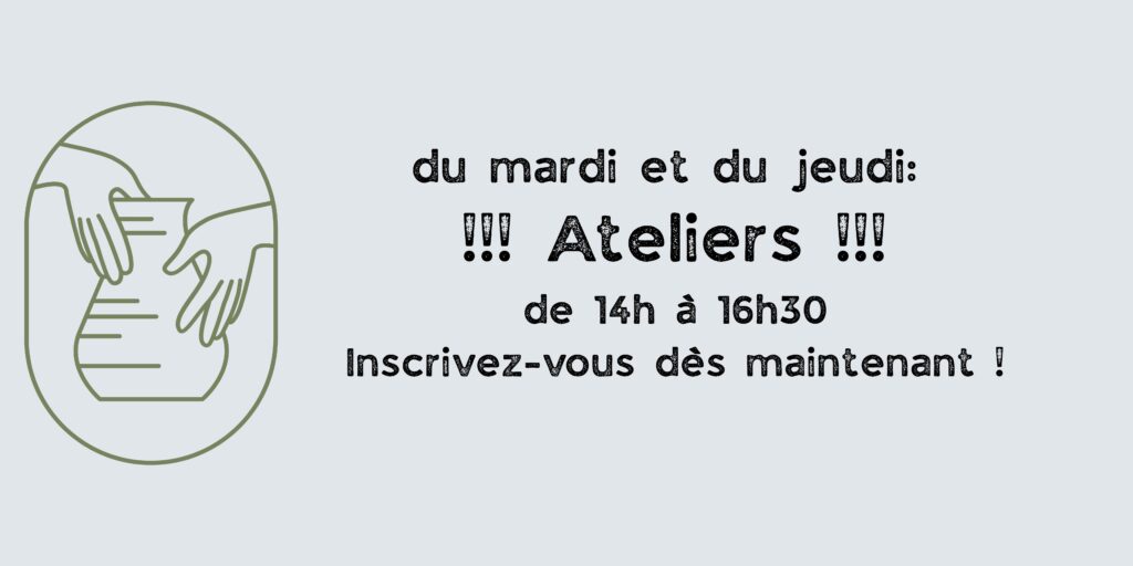 Quand? Tous les mardis et jeudis après-midi de 14h à 16h30. Inscrivez-vous via le formulaire de contact. Sur demande et dans la mesure du possible, il est possible de s’écarter des jours d’atelier standard.