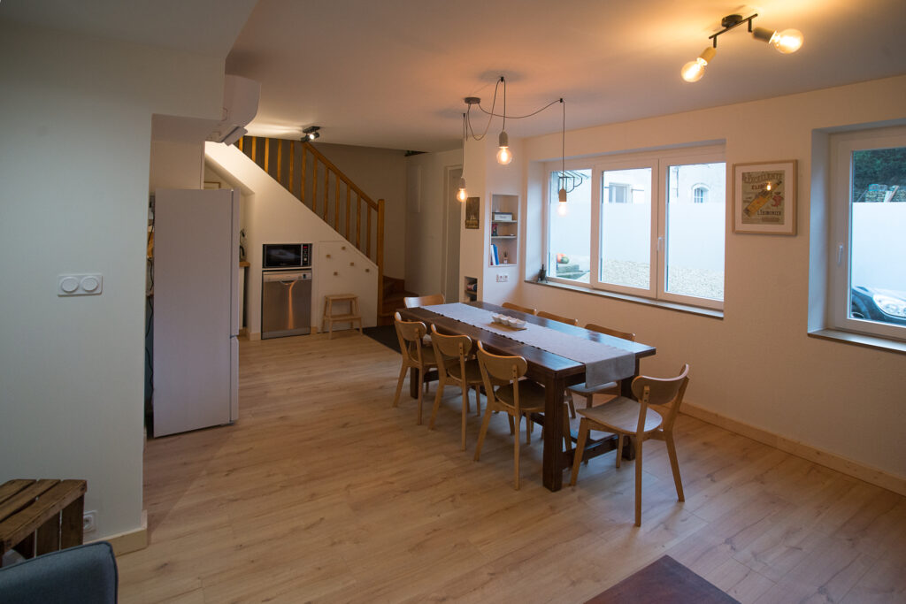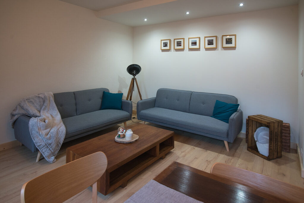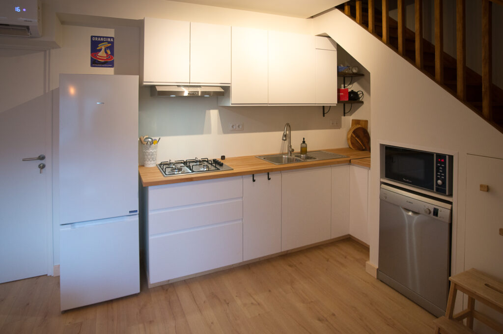 fully equipped kitchen with gas stove, microwave, kettle, coffee maker, dishwasher, and fridge with freezerlounge area